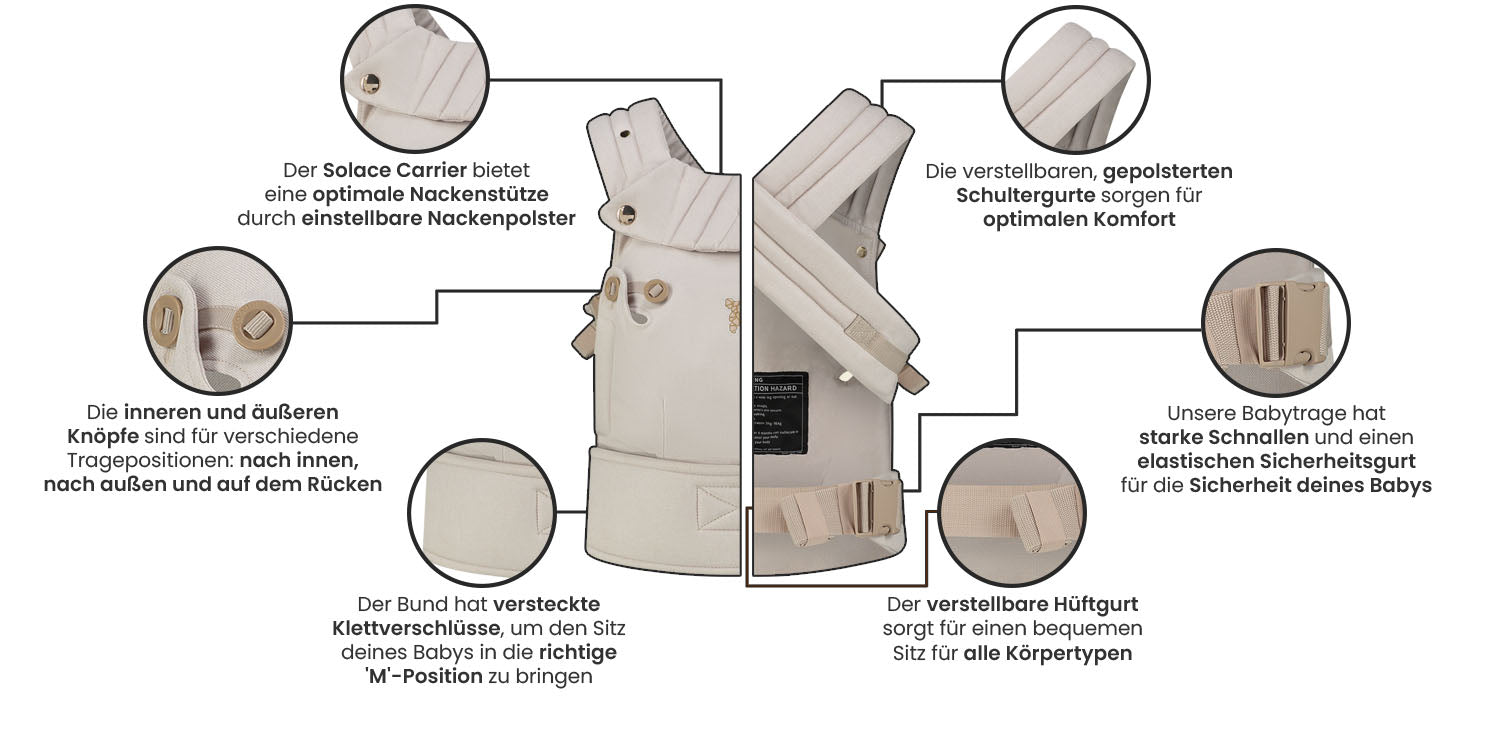 Sicherheit hat bei uns oberste Priorität. Bitte lesen Sie vor der Verwendung sorgfältig die Anweisungen in der Gebrauchsanweisung durch. Stellen Sie immer sicher, dass die Atemwege Ihres Babys frei sind und der Träger ordnungsgemäß befestigt ist. Wenn Sie Fragen oder Bedenken haben, zögern Sie nicht, uns zu kontaktieren. Der Komfort und die Sicherheit Ihres Babys haben für uns höchste Priorität.